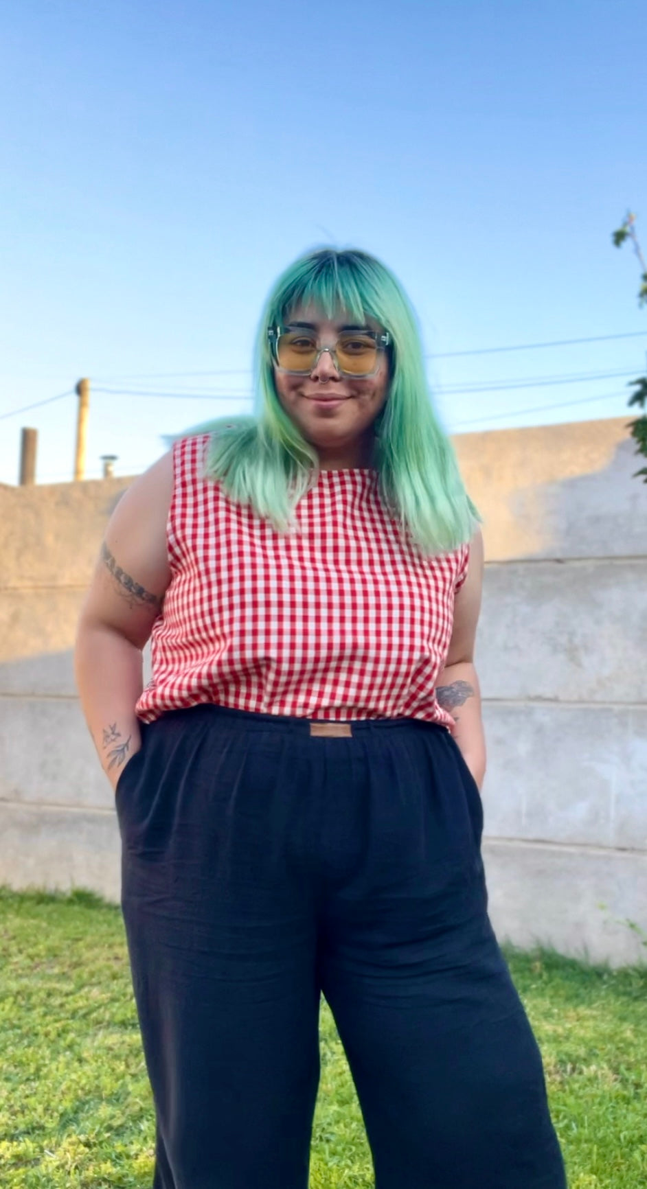 Detalles: Escote redondo y sin mangas. Torso de calce recto, no ajustado. Bajo la cintura, arriba de la cadera. Ideal para usar con botro M de tiro alto.