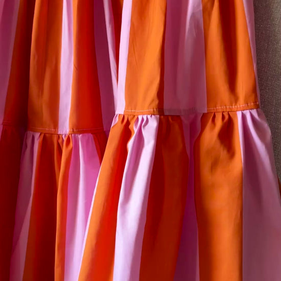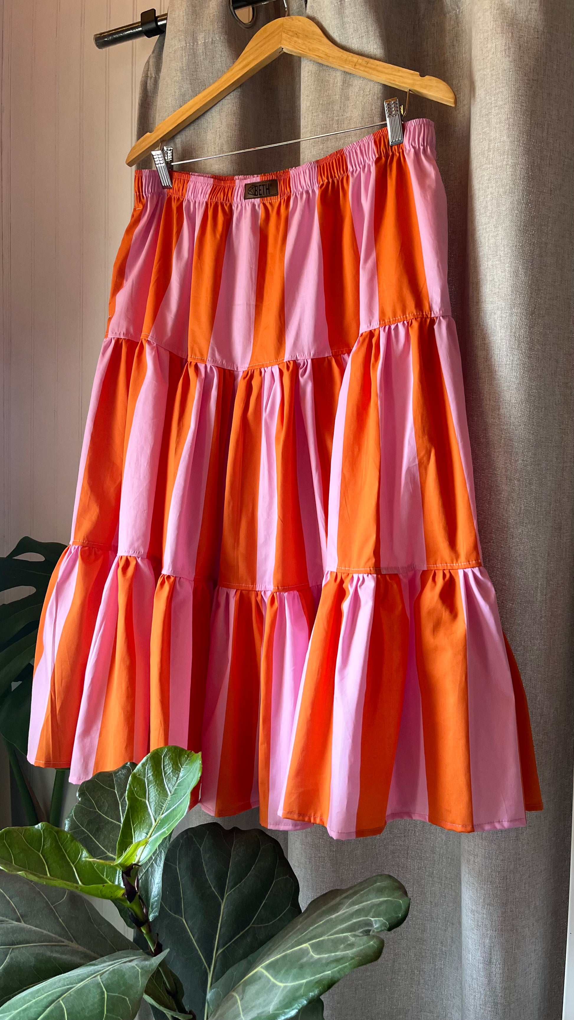 Detalles: Falda Cassie de franjas recogidas y una hermosa caída que queda bien en todo tipo de silueta. La pretina es elasticada. El elástico es de baja tensión, para que ajuste y soporte el peso de la falda pero no presione fuertemente el vientre.